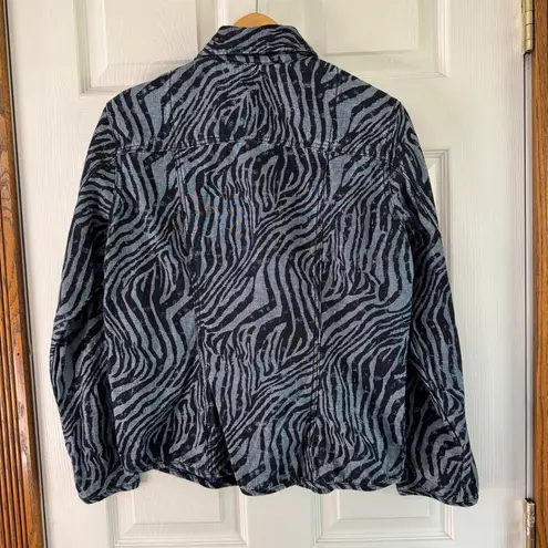 Unleash your inner wild child with this striking Chico's denim jacket! A bold zebra print in shades... Show more