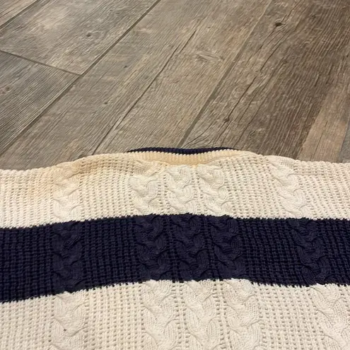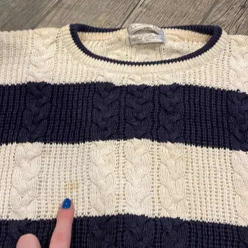 Stay stylish and comfortable with this navy and cream striped sweater. Perfect for any casual occasi... Show more