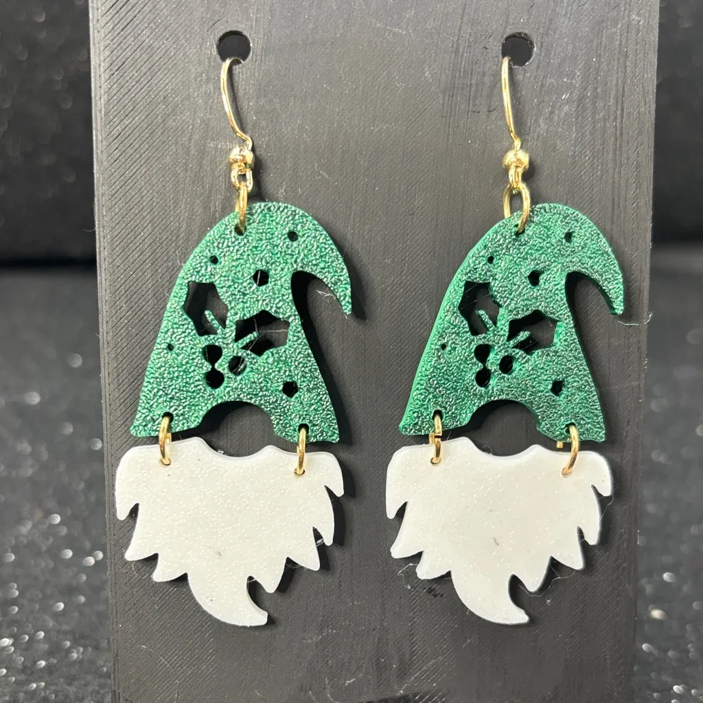 Celebrate the season with these adorable 3D printed Christmas gnome earrings! Each earring features a cheerful gnome with a green hat and classic white beard, ready to bring festive fun to any outfit 💚❄️ Perfect for holiday parties, gifting, or adding a touch of whimsy to your winter look! • Lightweight 3D printed design • Colors: Green, white, and red accents 🎄 • Length: approx. 2.50 in • Width: approx. 1.50 in • Gold-tone hooks for a warm, festive finish ✨ These charming gnome earrings are the perfect way to spread Christmas cheer all season long! 🎅🎁 D848