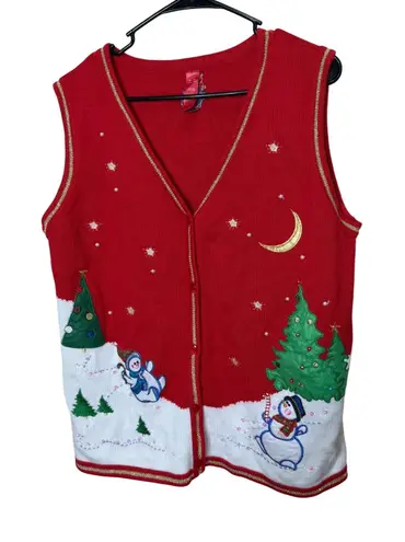 A festive red sleeveless sweater vest adorned with a delightful winter scene. Features embroidered snowmen, Christmas trees, and a crescent moon with scattered pearl-like embellishments and gold stitching accents. The front closes with red buttons. The hem and neckline are trimmed with gold sparkle threading. Type: Vest Outer Shell Material: Acrylic Accents: Embroidered, Beaded, Button Features: Pockets, Collarless Fabric Type: Knit Pattern: Solid Season: Winter Occasion: Casual, Party/Cocktail Sleeve Length: Sleeveless Fit: Regular Keywords: ugly Christmas sweater, holiday, winter, festive, snowman theme, Christmas apparel, seasonal clothing, modern Measurements laying flat Length: 26 in Pit to Pit: 22 1/2 in