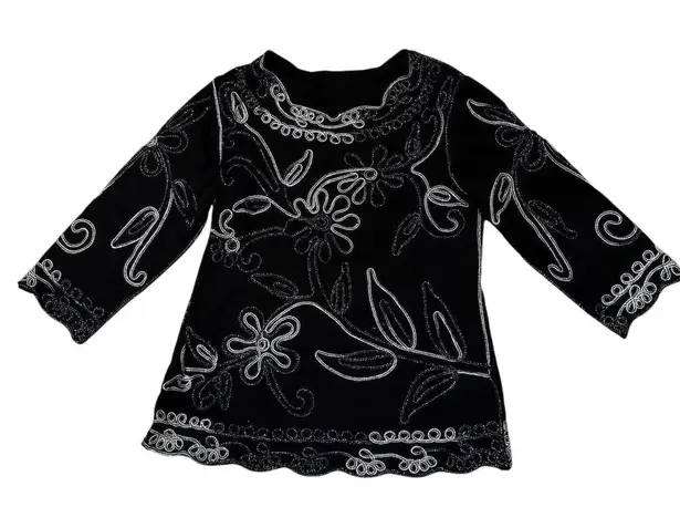 This Christopher & Banks blouse in size M is designed for women and features a black floral pattern with embroidered accents. It has a basic style with 3/4 sleeves and a scalloped hem, making it suitable for casual occasions, especially in the fall season. The blouse is made from soft fabric with delicate embroidery. It is pre-owned. Keywords: Christopher & Banks, women's blouse, black floral, embroidered, 3/4 sleeve, scalloped hem, casual wear, fall fashion, soft fabric, pre-owned clothing. Brand: Christopher & Banks Size: M Color: Black Department: Women Type: Blouse Style: Basic Sleeve length: 3/4 Sleeve Pattern: Floral Accents: Embroidered Features: Scalloped Hem Occasion: Casual Season: Fall Material: Soft fabric, Delicate embroidery