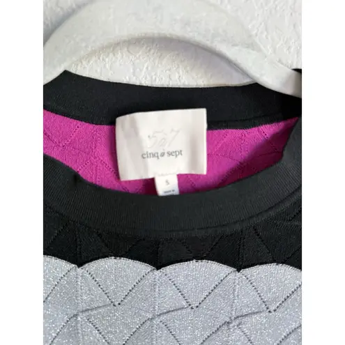 Scalloped stripes bound across this dainty pointelle sweater shot with metallic fibers for a hint of shine. •Crew neckline •Long ribbed-knit sleeves •Fitted •Pullover style •Scalloped striped pattern with open knit details •74% viscose, 24% polyester, 1% metallic, 1% nylon •Color: Pink Ruby/Multi •Dry clean In great preowned condition Length 20" Bust 30" Sleeves 23.5"