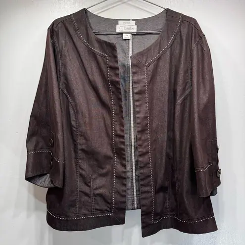 CJ Banks Brown Open Front Topper Jacket with Bold Beige Stitching and Large Buttons on the 3/4 length Sleeves. Cotton polyester blend. Women’s size 2x. Excellent condition. Clean, smoke free home and studio. Five star seller. Super fast shipping! Bundle 2+ items for 20% off! Measurements 26” armpit to armpit 23” length *measurements are approximate SKU# 251011 38 Lightweight, topper, layering piece, cool weather, vacation, cruise wear, resort wear, colorful, classic, shacket, blazer, windbreaker, fall