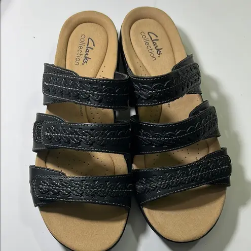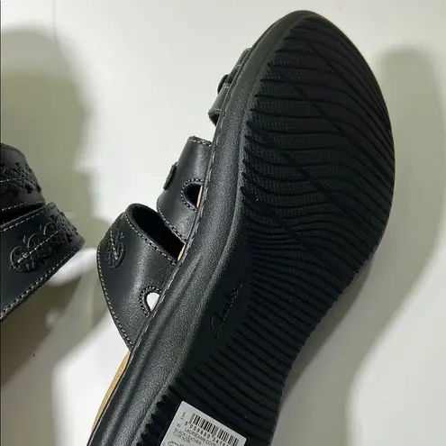Experience ultimate comfort with Clarks sandals, featuring a stylish two-strap design in black leath... Show more