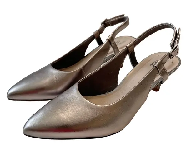 Gleaming pewter finish elevates these Clarks slingback heels, perfect for adding a touch of modern elegance to any ensemble. The sleek pointed toe creates a sophisticated silhouette, while the adjustable slingback strap ensures a secure and comfortable fit. A modest kitten heel provides just the right amount of lift, making these shoes ideal for all-day wear. Imagine stepping into a gallery opening, attending a chic cocktail party, or enjoying a sophisticated dinner date in these versatile and stylish heels.