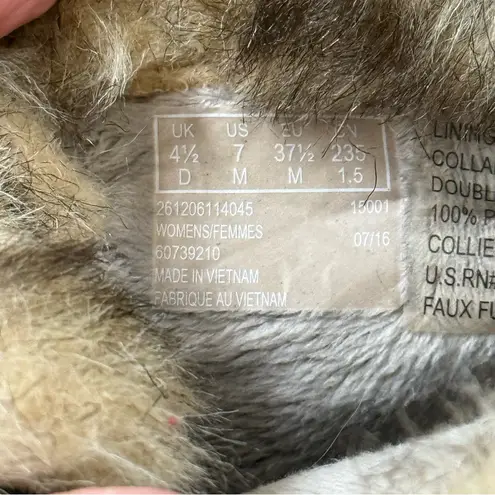 Taupe and brown colored lace up ankle length winter boots. Has faux fur lining and suede leather and... Show more