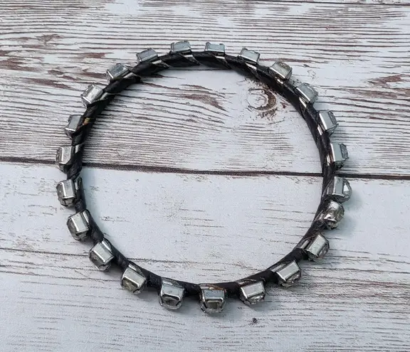Inner circumference measures about 8". Black looks like a fabric wrap between the gems. Metal has ru... Show more
