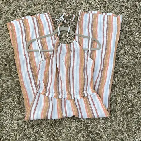 Halter style, cropped jumpsuit. Long torso with elastic waist Rayon/Linen Blend Blue/beige/peach st... Show more