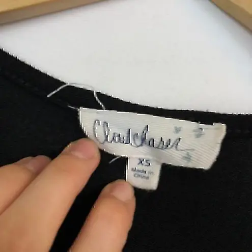 Cloud Chaser size XS extra small solid black v-neck knit with crochet embroidered semi sheer floral trim 65% polyester, 35% rayon; chiffon: 100% polyester no flaws found other than slightly pilly; small hole in armpit seam minor unnoticeable runs/snags possible Measurements as follows: Bust (laid flat): 17 in (Fits 34") Length: 25.5 in Inv #5903 ght