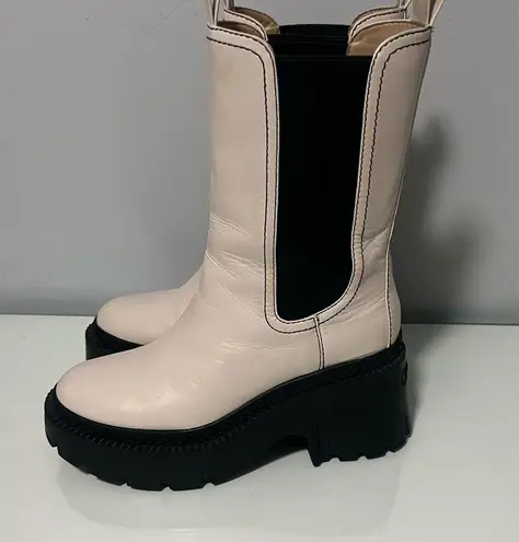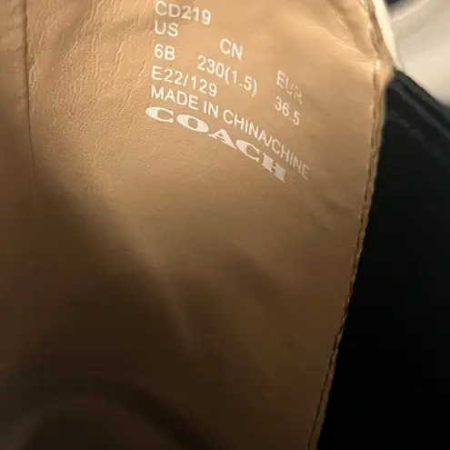 Elevate your look with these stylish Coach ankle booties. Cream leather with black accents. Chunky p... Show more