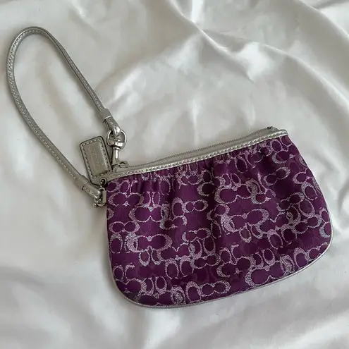 Rare and authentic Coach Signature wristlet in a stunning metallic purple Lurex jacquard fabric. Thi... Show more