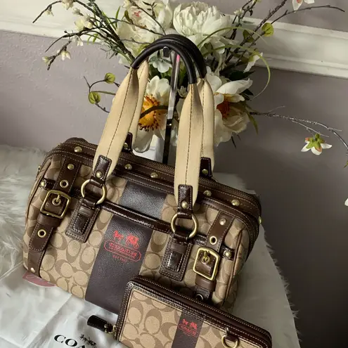 Elegant Coach set with signature pattern. Includes matching handbag and wallet. Features rich brown... Show more