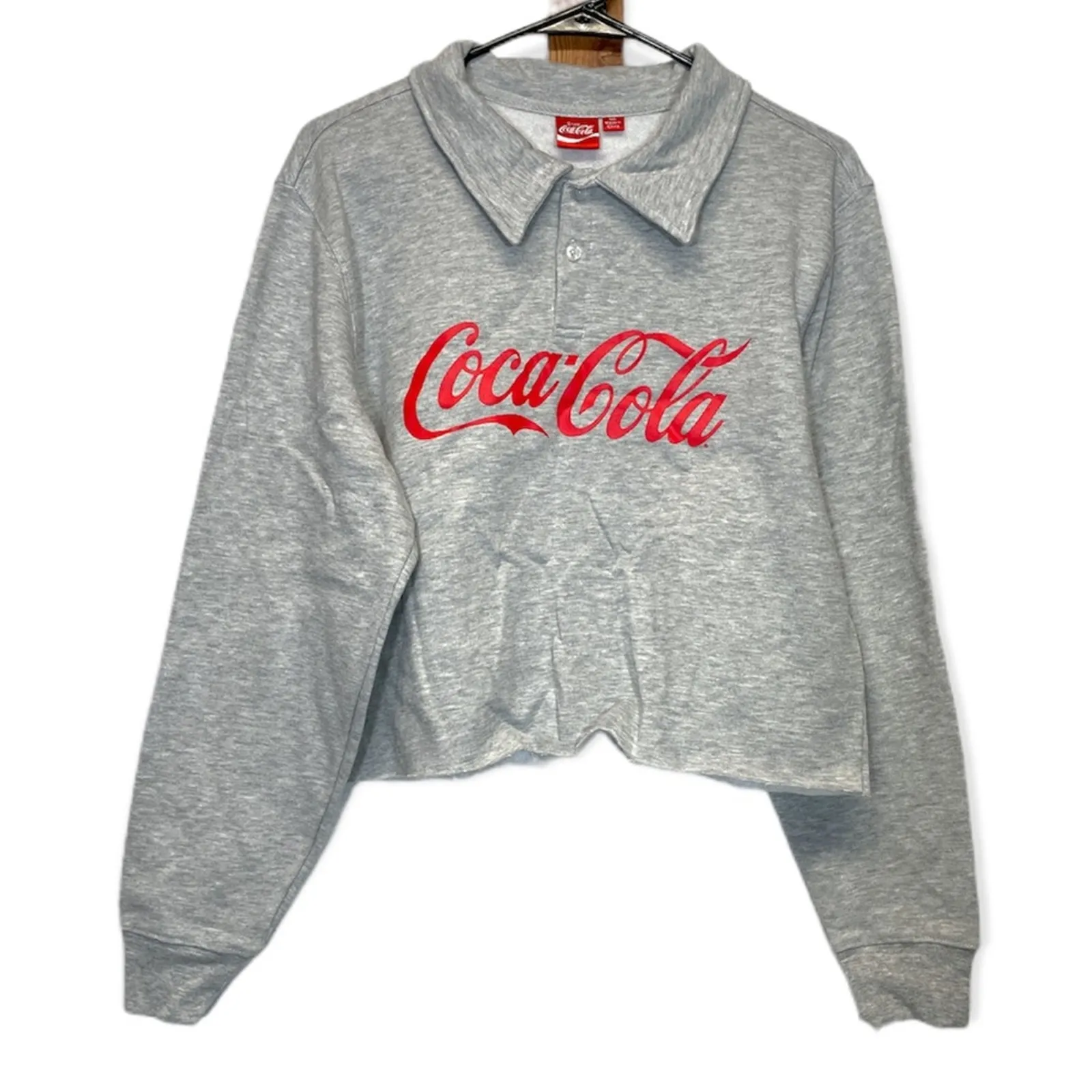 Cocoa Cola Gray & Red Long Sleeve Raw Hem Cropped Pullover Sweater Long sleeves Collared 2 button closure Cropped Raw hem 60% cotton, 40% polyester Size: M Measurements are provided in pictures Condition: NWT