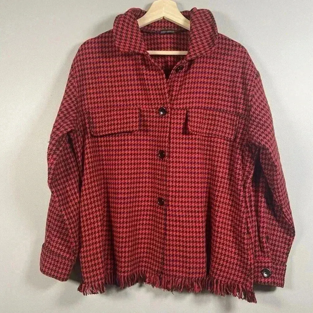 Elevate your outerwear collection with this striking houndstooth shacket. This piece features a classic button-down design, complemented by a stylish fringe hem and chest pockets. The bold red and black pattern adds a touch of sophistication, while the relaxed fit ensures comfort and versatility. Perfect for adding a pop of color and texture to your everyday outfits, whether you're heading to a casual brunch, a weekend market, or a cozy evening by the fireplace. Keywords: shacket, houndstooth, fringe, red, black, button down, shirt jacket, casual, outerwear, womens, coco carmen, jacket, coat, fashion, stylish