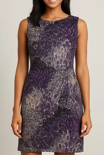 Elegant sleeveless sheath dress by Connected Apparel featuring a rich purple, black, and taupe abstract floral pattern. Flattering fitted silhouette with soft stretch fabric that moves comfortably. Perfect for work, dinner, or special occasions. Size: 10 Color: Purple Multi Made in: Sri Lanka