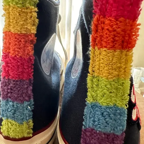 Stylish Converse high-top sneakers featuring a vibrant rainbow patch and peace symbol. Perfect for a... Show more