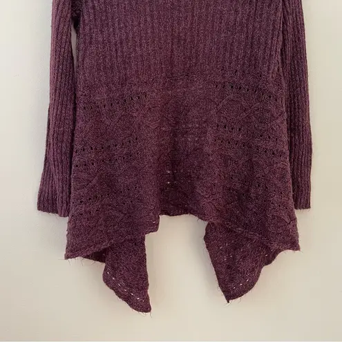 Open, waterfall front Long sleeves Mixed knit with ribbed and open knits Soft and fuzzy knit Tun... Show more