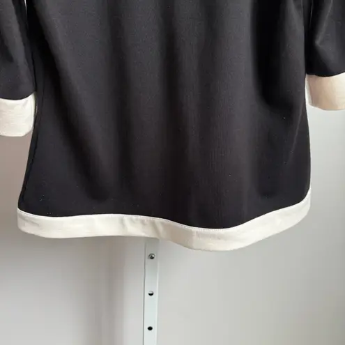 Covington sz M black white open button cardigan Gently used with no flaws This is a pre-owned Covington brand jacket, size M/M. It features a black body with white trim around the collar, front opening, and sleeve cuffs. The jacket has a button-up closure with six round, light-colored buttons. There are two decorative pockets at the front. The jacket has 3/4 sleeves. The material appears to be a knit blend. There are no immediately visible imperfections. Measurements: Armpit to armpit: 17" Length:23" #SS31 Weight: 11 oz All thrifted items have been carefully washed with hypoallergenic laundry detergent and packaged with love.
