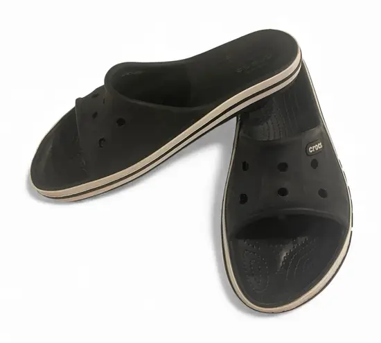 Sleek black slides with perforated design. Features white trim and Crocs logo.