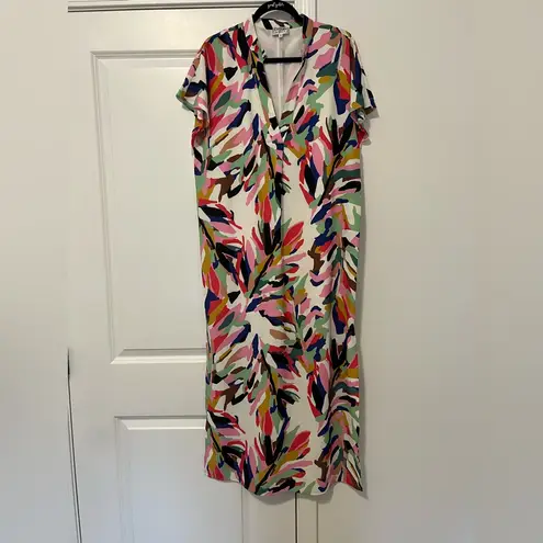 Chic dress with a striking abstract pattern. Features green, blue, pink, and brown accents. Ideal for a standout style. V neck Midi length Polyester Machine wash Chest: 23.5” Length: 52.5” Great used condition / no flaws or signs of wear