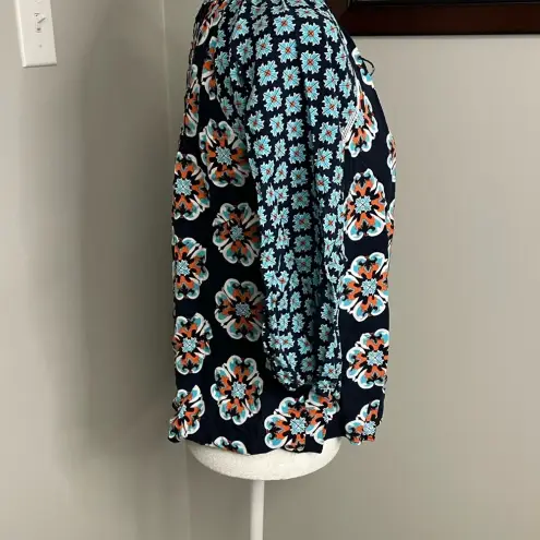 Lace embellishment down front and tie at neckline, 3/4 angled sleeves, bright blue, white and navy.... Show more