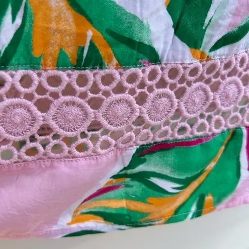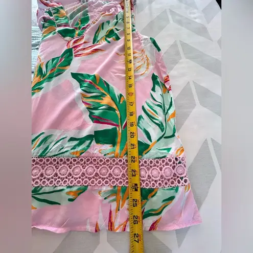 Colorful sleeveless top with a leaf pattern. Features a mix of vibrant hues.