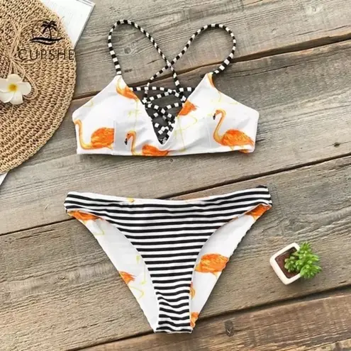 Cupshe Flamingo bikini reversible bottom swim suit Size XS White background with orange flamingo rep... Show more
