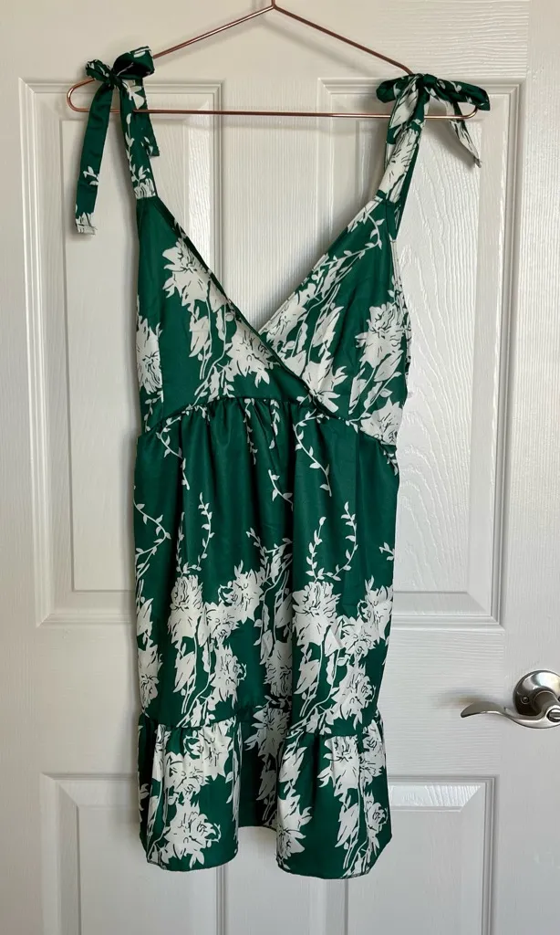 Chic mini dress with floral pattern. Features tie straps and a flattering fit. Perfect for summer ou... Show more