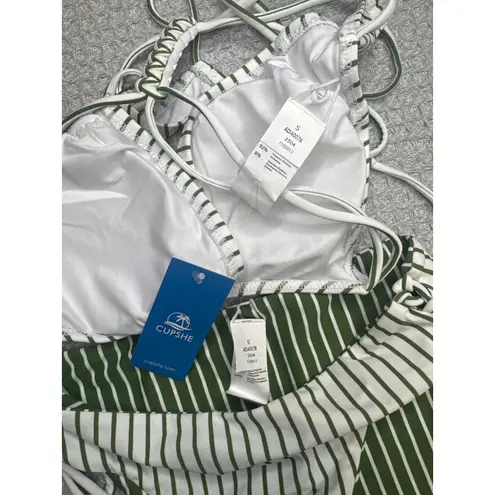 Keywords: Cupshe bikini, striped swimsuit, green white bikini, criss cross bikini, tie side bikini, halter bikini, swimwear, beachwear, summer fashion, vacation outfit, pool party, string bikini, adjustable bikini, women's swimsuit, new with tags