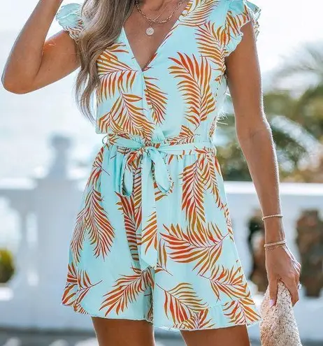 Chic romper with a colorful leaf design. Features a flattering tie waist and flutter sleeves. Ideal... Show more