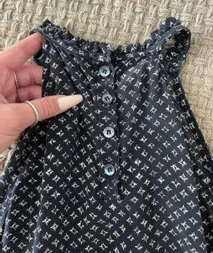 black cynthia rowley 100% silk tank top with white pattern, high neck, ruffle details & button closu... Show more