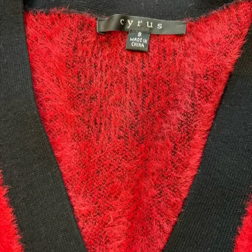 Cyrus Red/ Black Buffalo Plaid Button Down Fuzzy Cardigan Sweater. V-Neck, long sleeve, button down. Two front pockets. Size: Small Approx measurements: Armpit to armpit: 18.5” Length: 27” Pre-owned, very good condition