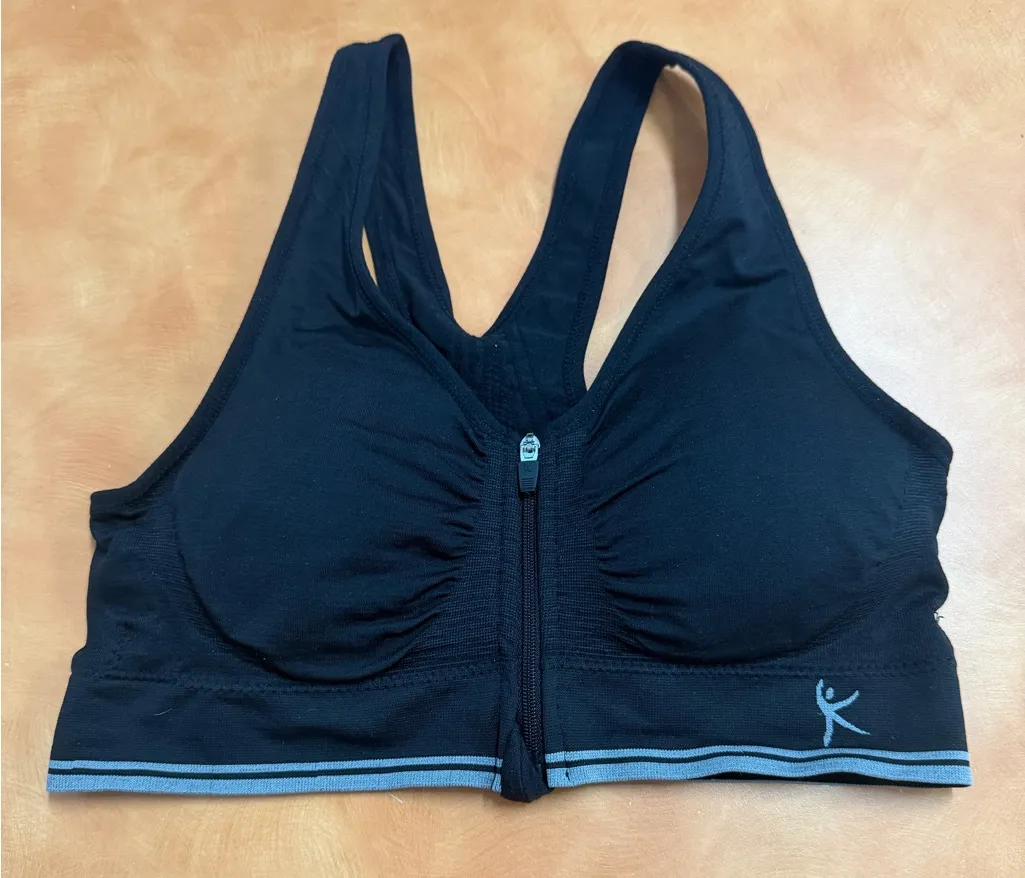 Sleek black sports bra with gray accents. Ideal for active wear. Features a front zipper for easy ac... Show more