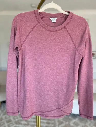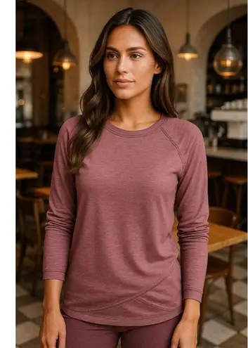 Soft and lightweight Danskin long sleeve pullover in a heathered mauve shade. Features a curved layered hem for a flattering silhouette, perfect for loungewear or light workouts.
