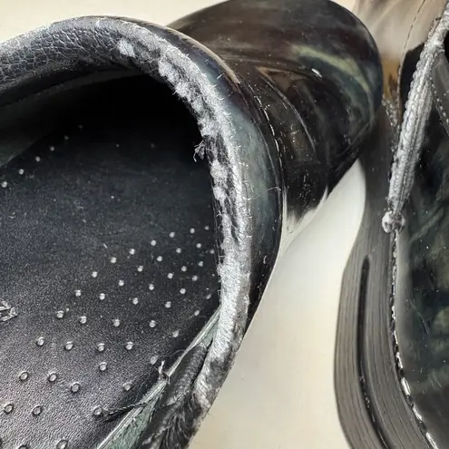 These are classic clog-style comfort shoes for women by Dansko, featuring a black patent leather upper with a cloudy silver pattern. They have a round toe shape, slip-on closure, and are a size 42 in EU sizing (equivalent to US 11.5). The shoes have a medium width and are suitable for career casual occasions.