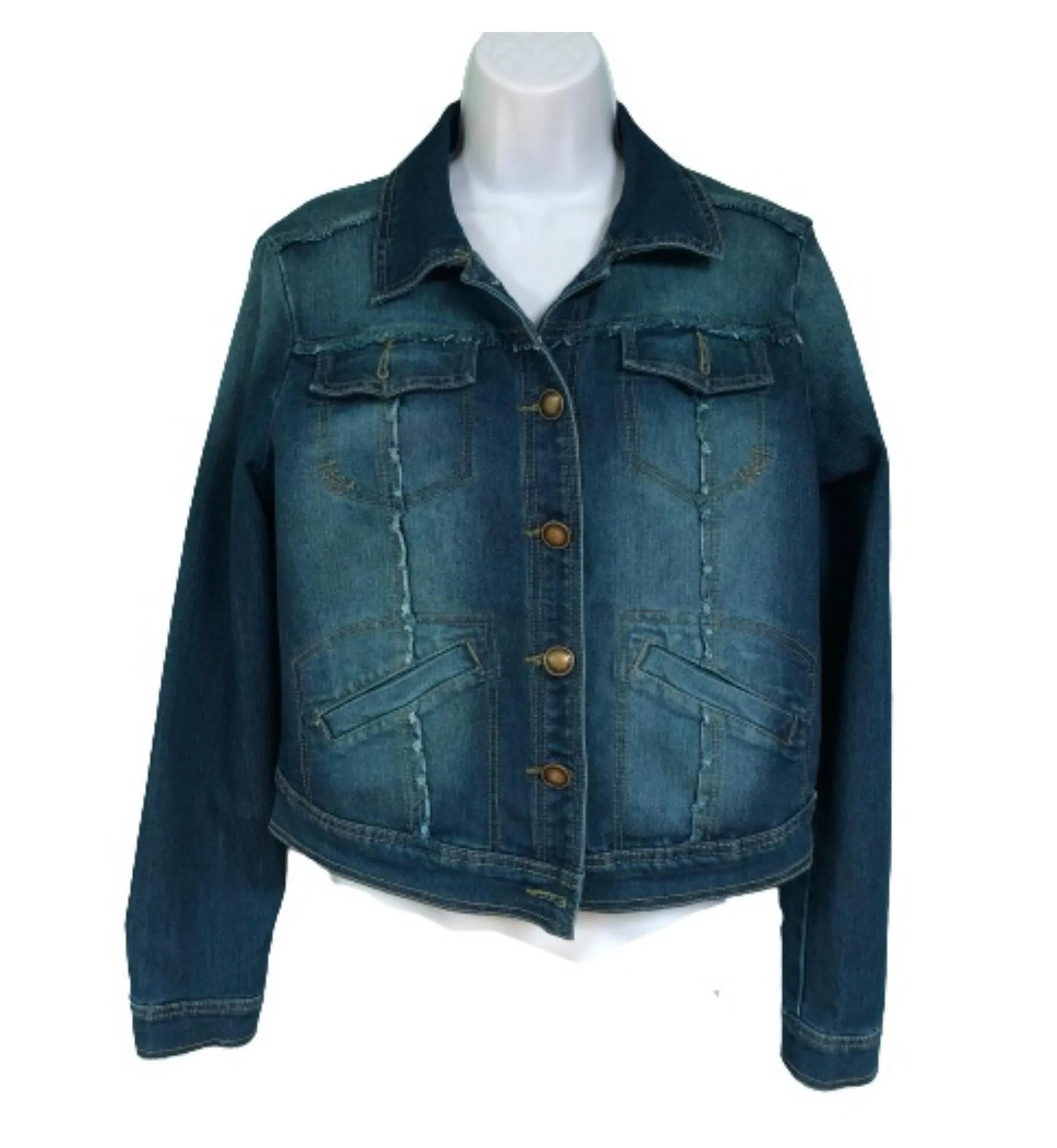Women’s dark wash lightly distressed jean jacket from Jou Jou - vertical lines of slight distressing on front and back - 4 front pockets - excellent used condition MSRP: $58 61% cotton, 37% polyester, 2% spandex