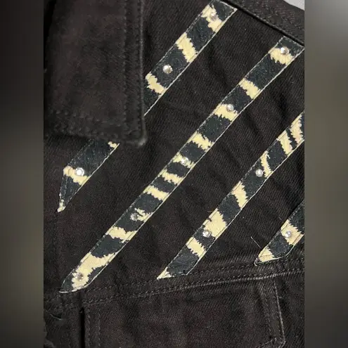 100% cotton 90s /N2K style Blue jean with animal print and rhinestone accents Collared ; Sleeveless Double front, flap chest pockets Fabric covered button front. Excellent condition Size Large