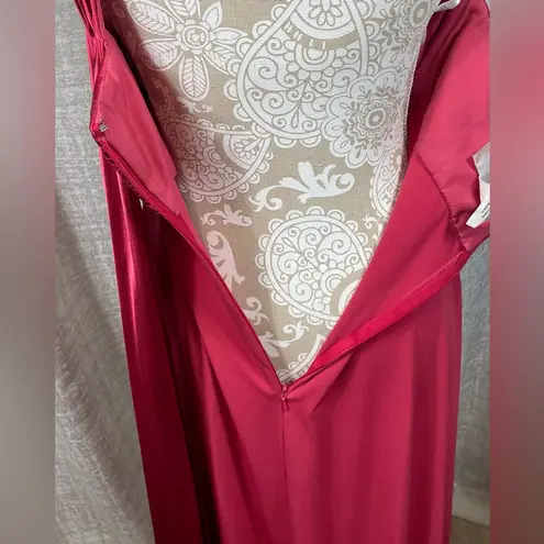 Elegant David’s Bridal floor-length gown in a rich rose/red shade. One-shoulder pleated satin bodice... Show more