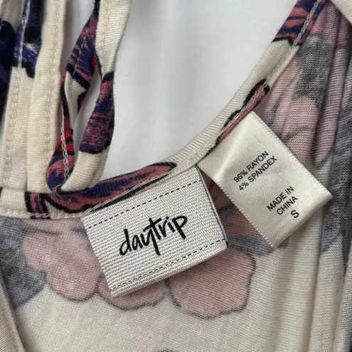 A cream colored tank top with a vibrant floral print featuring shades of deep red purple pink and bl... Show more