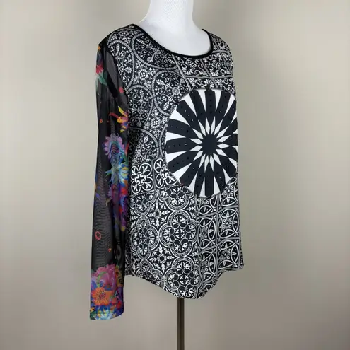 Desigual Top Womens Large Black Multicolor Floral Long Sheer Mesh Sleeve Y2K L Very good condition! Measurements are in the photos. Fabric content and washing / care information in photos - see tag photos. Pullover Lightweight Sheer mesh sleeves - semi sheer body Geometric pattern Rhinestone embellishment Whimsical, Whimsy All preowned items have been cleaned. Stored in a smoke and pet free home. Thanks for looking!