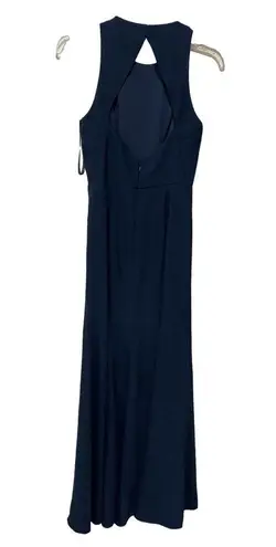 A simple silhouette is enhanced by the open details in this sleeveless crepe dress. An open back diamond cut out sits above a natural waist for a flattering effect. The full-length trumpet skirt features a slit at the side front for ultimate versatility. Center back zip.” Size 4 Measurements (approximate,) taken flat: Bust (from pit to pit:) 15.5” Waist: 13.5” Length: 60” Slit is 27” Color is midnight blue. Style is 3029 Keywords: Special Occasion, Evening, Party, Formal, Elegant, Wedding, Cruise, Gala, Ball, Vacation, Pageant, Cocktail, Pretty, Gorgeous, Stunning, Feminine, Flirty, Bridesmaid, Rehearsal Dinner, Mother of the Bride, Prom