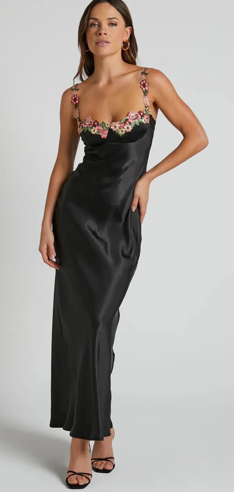Black satin formal maxi fitted dress with embroidered floral detail, size 0 with adjustable straps.... Show more