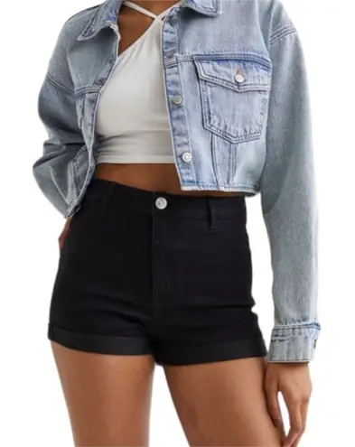 . Rolled hem, faux hip pockets, fitted style. Approx 13” across waistband, 2” inseam, 9” rise. Cotto... Show more