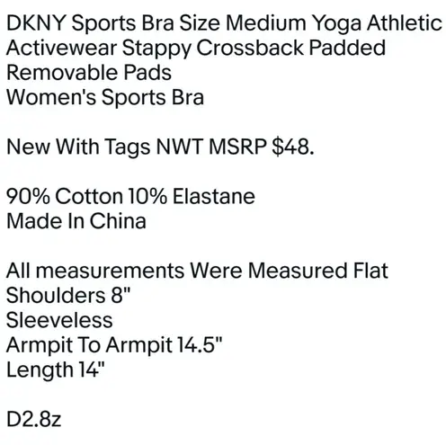 DKNY Sports Bra Size Medium Yoga Athletic Activewear Stappy Crossback Padded Removable Pads Women's... Show more