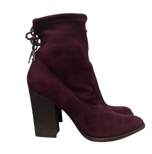 Dolce Vita Cammi Suede Sock Heeled Booties Very good used condition, minimal signs of wear. - Mid calf, ankle boots - Faux suede material - Sock, flexible fabric - Lace up back with silver details - Layered block heel - Burgundy, deep red color - 3" heel All items come from a smoke & pet free environment and ship same or next business day.