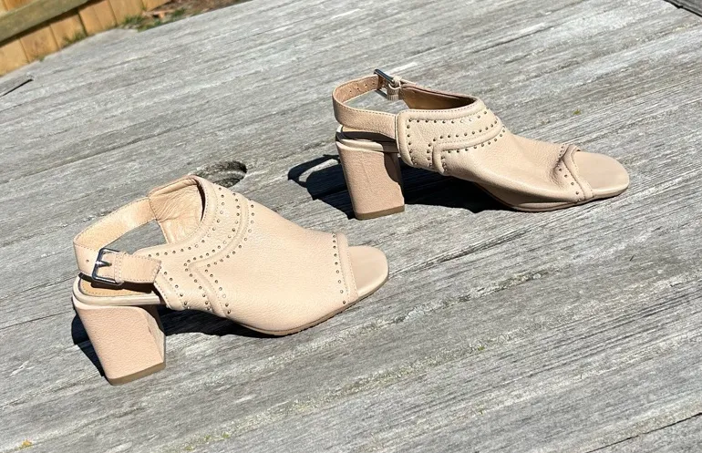 DONALD PLINER Penny Open Toe Slingback Mule In Putty size 5.5 Worn once, minor marks from wear as sh... Show more