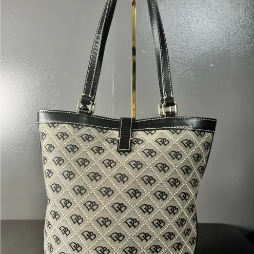 EUC Dooney and Burke Black and Grey bucket bag with leather trim and straps , blue duck metal Hangta... Show more