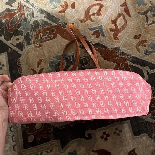 Chic pink tote with tan accents. Features signature logo pattern. Ideal for daily use. In excellent... Show more