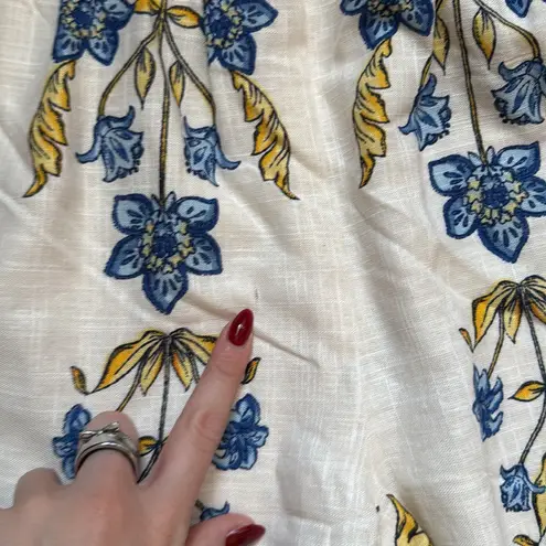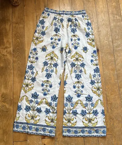 Chic floral pants with vibrant blue and yellow design. Ideal for casual outings. small black thread/mark? on the back view last photo hardly noticeable FEATURES No closure - pull-on styling Back elastic waistband 2 pockets Slub linen fabric construction Fully lined FIT & SIZING 29-in. inseam Wide 26-in. leg opening High rise sits below the natural waistline Relaxed fit through the hip and thigh Regular fit FABRIC & CARE Body: rayon, linen Lining: rayon Machine wash and tumble dry low Imported