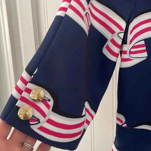 In excellent used condition! This beautiful fit and flare dress from Draper James features a V-neck, elbow length sleeves with button details, an exposed zipper in the back and beautiful pleats and darting throughout. It is fully lined, and it has pockets! The dress is navy with a pink and white ribbon pattern. Approximate measurements and photos. From a smoke free home.